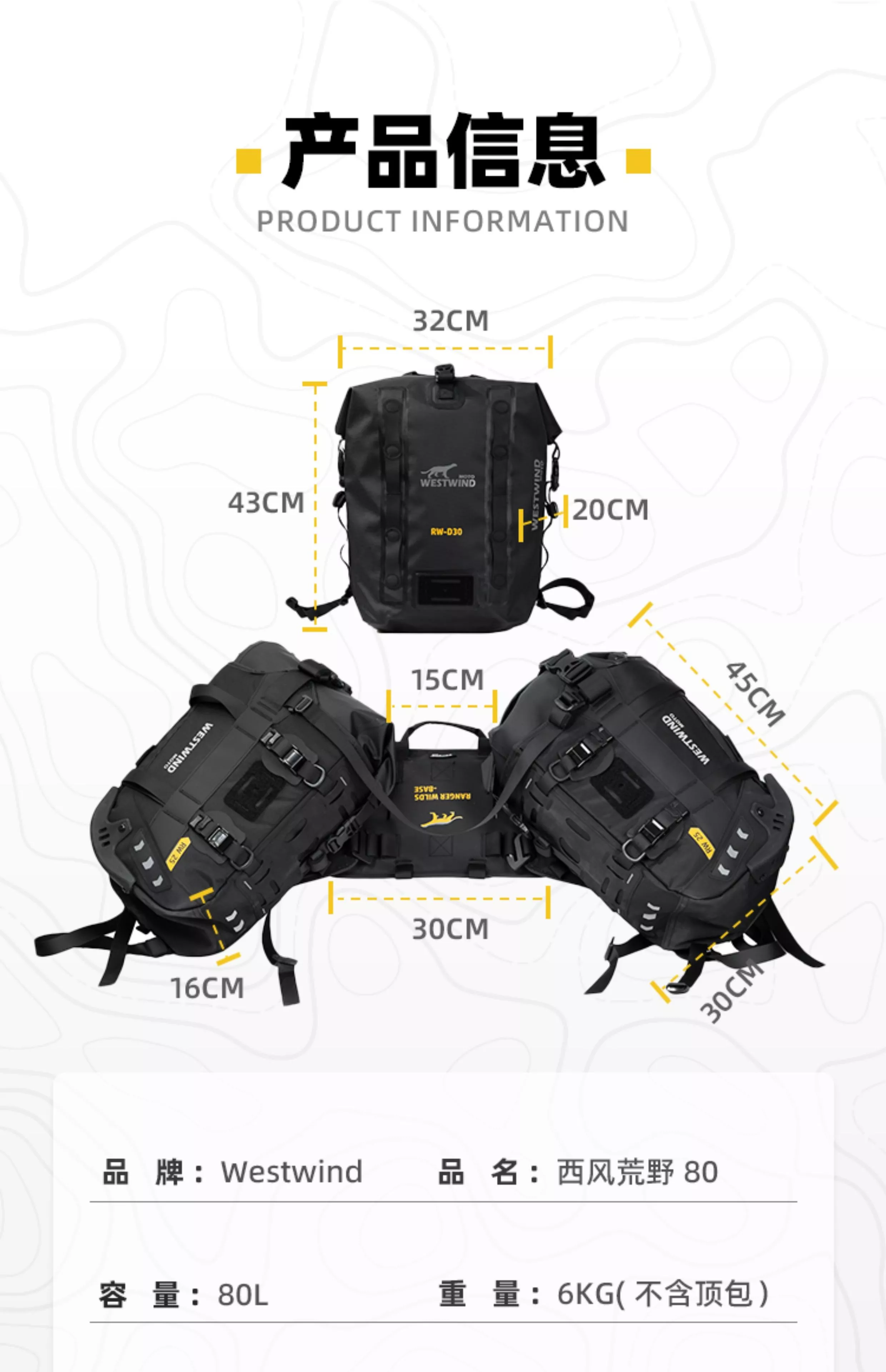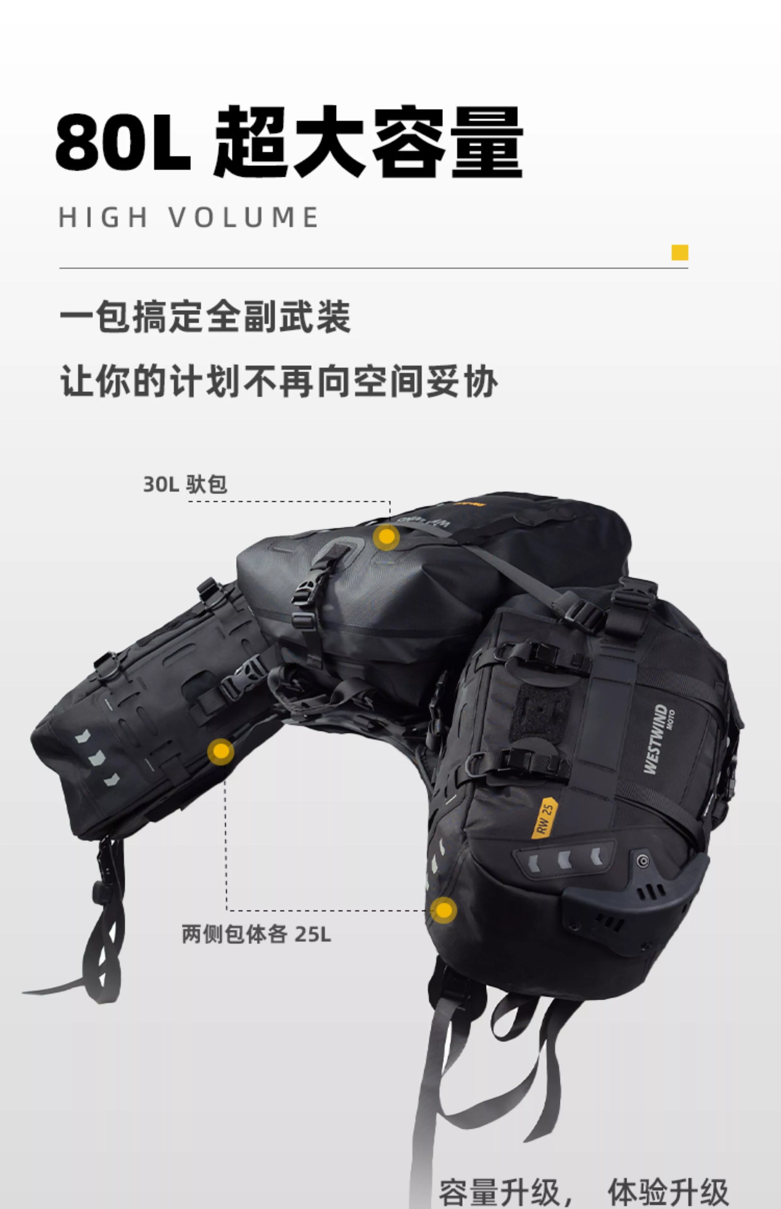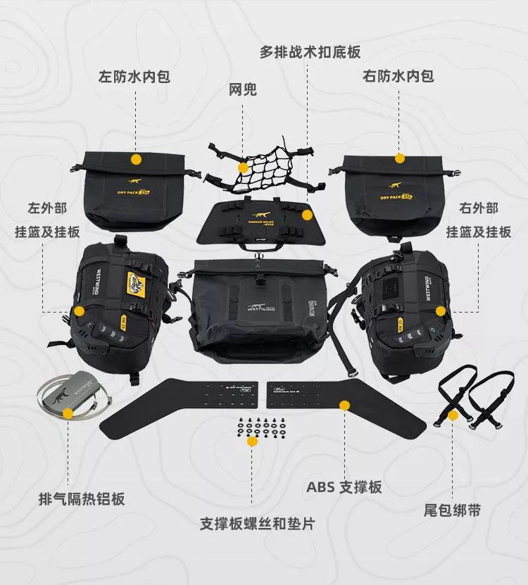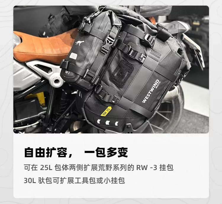 ※荒野鞍包RW80是最大容量的越野鞍包,可在兩側25L主包上可利用Molle功能再加固定RW3L掛包,總容量擴增為86L,充分滿足您長途探險的裝載需求。