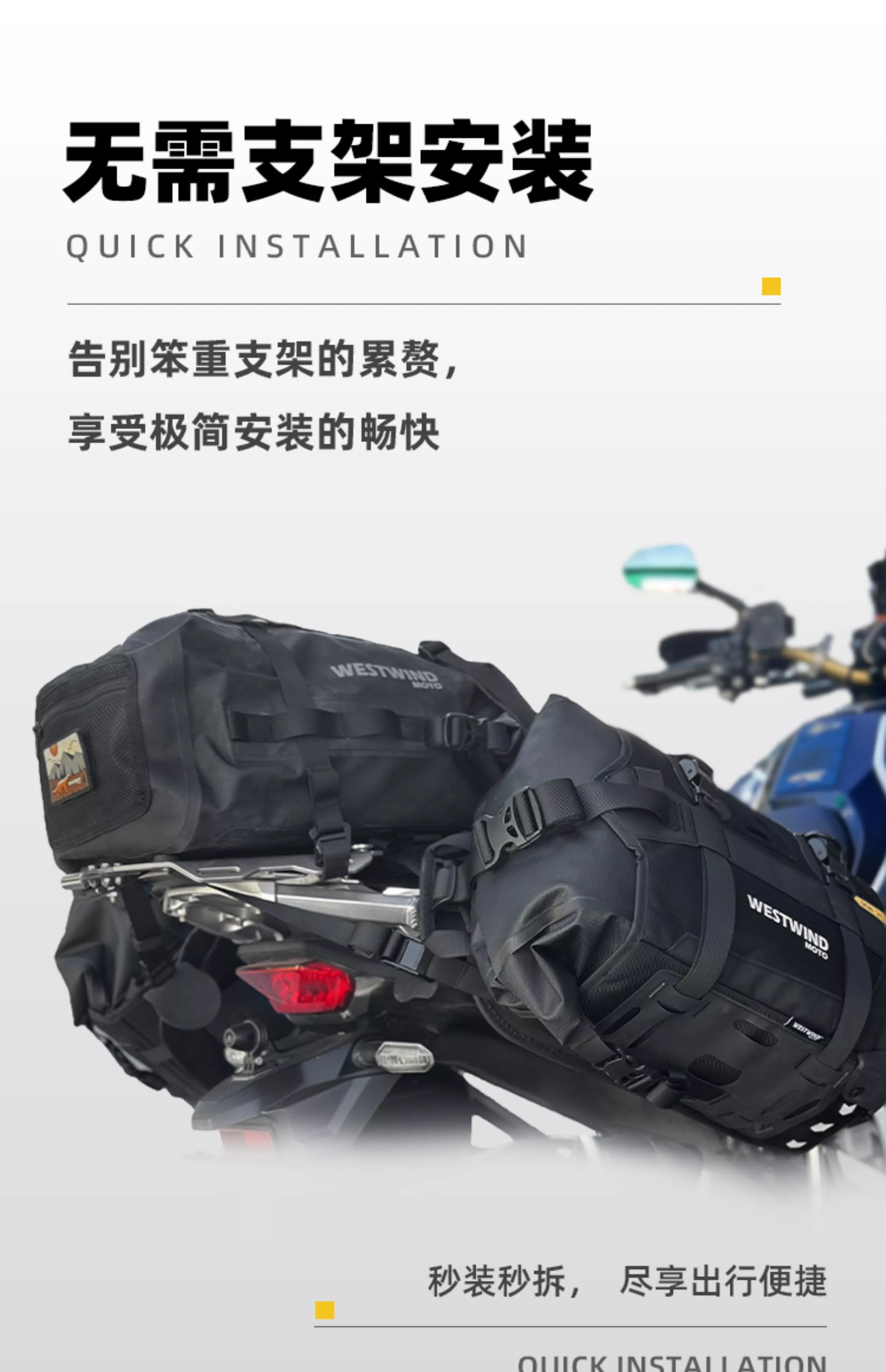 ※WESTWIND西風 荒野鞍包RW系列無需支架即可直接安裝,經由至少四個錨點綁定後便能提供韌性十足、耐磨、防水的裝載能力。